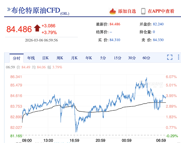 国际原油价格一度突破 85 美元大关,上涨近 6%。